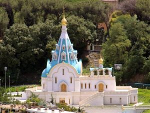 All’interno delle diverse confessione cristiane troviamo anche diversi modi di costruire e adornare le chiese. La chiesa ortodossa di S. Caterina Martire di Alessandria sembra guardare il Vaticano perché sorge in cima alla stazione ferroviaria Roma S. Pietro, all’interno del perimetro di proprietà dell’ambasciata russa.