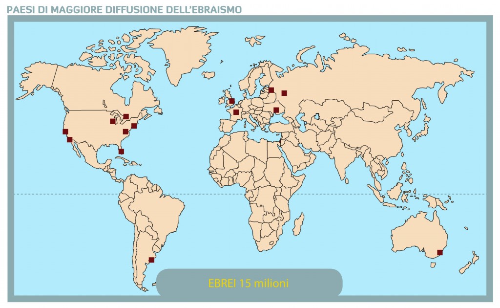 Fin dall’antichità, numerose comunità ebraiche erano diffuse in tutto il mondo, soprattutto lungo le vie dei commerci. Le principali erano a Roma, Costantinopoli, Babilonia, Alessandria d’Egitto. Dopo la distruzione del Tempio di Gerusalemme da parte dell’imperatore Tito (70 d.C.) solo una piccola minoranza di ebrei rimase in Palestina. Gli ebrei, pur essendo spesso vittime di pregiudizi e persecuzioni, si integrarono con la cultura del luogo dove vivevano, dando luogo a tradizioni molto diverse all’interno dell’ebraismo. Le principali sono la tradizione sefardita (da Sefaràd: “Spagna”), tipica degli ebrei che, cacciati dalla Spagna nel 1492, si sparsero nei paesi, prevalentemente musulmani, del Mediterraneo (Marocco, Tunisia, Turchia) e quella ashkenazita (da Ashkenàz, Europa dell’Est). La maggior parte degli ebrei ashkenaziti, che diedero un profondo contributo alla storia della cultura europea, perì durante la Seconda Guerra Mondiale: la memoria del loro sterminio organizzato dai nazisti (l’Olocausto, in ebraico shoàh) è un dovere per ogni ebreo.